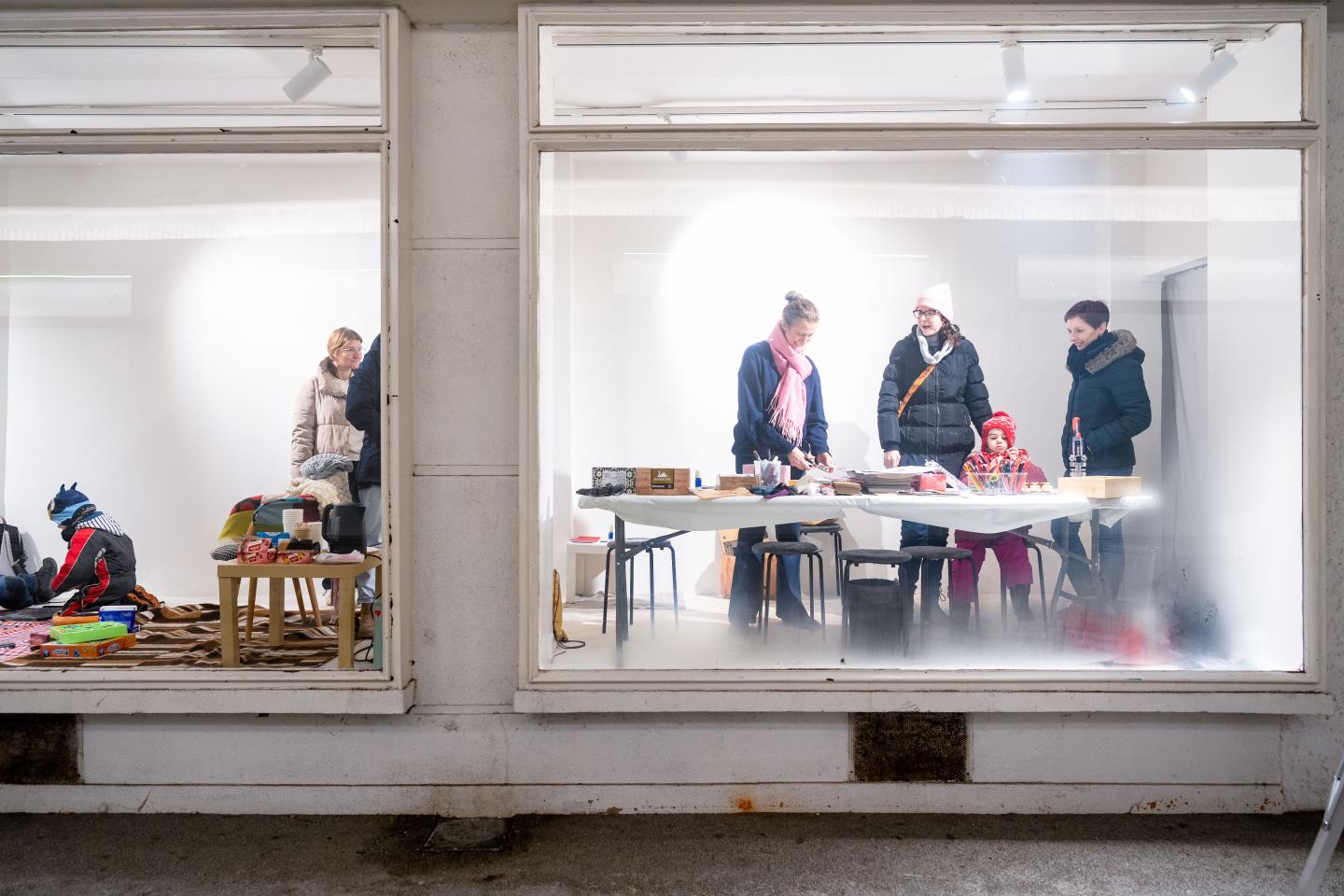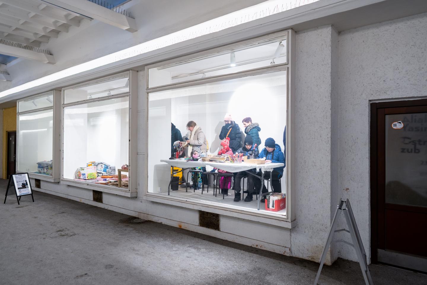 V úterý 3. 2. 2026 se Galerie Dukla na jedno odpoledne otevřela jinému rytmu. Komunitní setkání Okupace Dukly využilo přechodové období mezi dvěma výstavami, kdy byly vitríny prázdné a prostor galerie sloužil k pobývání.